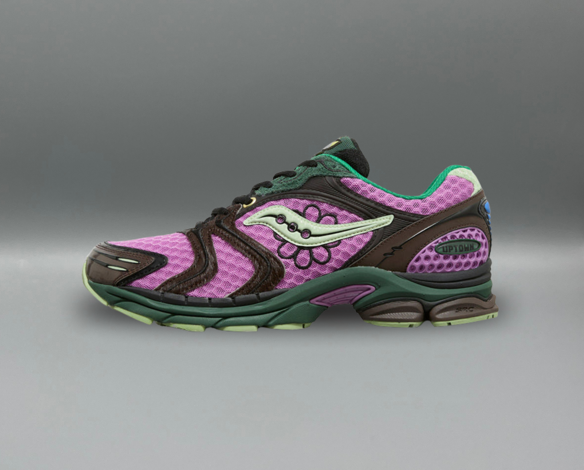 La Saucony ProGrid Triumph 4 x Jae Tips "Perrilla" incarne une fusion unique entre design urbain et nature sauvage. Sa teinte mêle violet, vert et brun, rappelant les feuillages qui percent la ville grise. Conçue avec une base en mesh renforcée par des panneaux en cuir et matériaux synthétiques, cette édition se distingue par ses détails raffinés : gravures et broderies florales, mini-logo Jae Tips et l’inscription « UPTOWN » qui racontent une véritable histoire visuelle. Un modèle expert alliant confort technique et esthétique réfléchie.