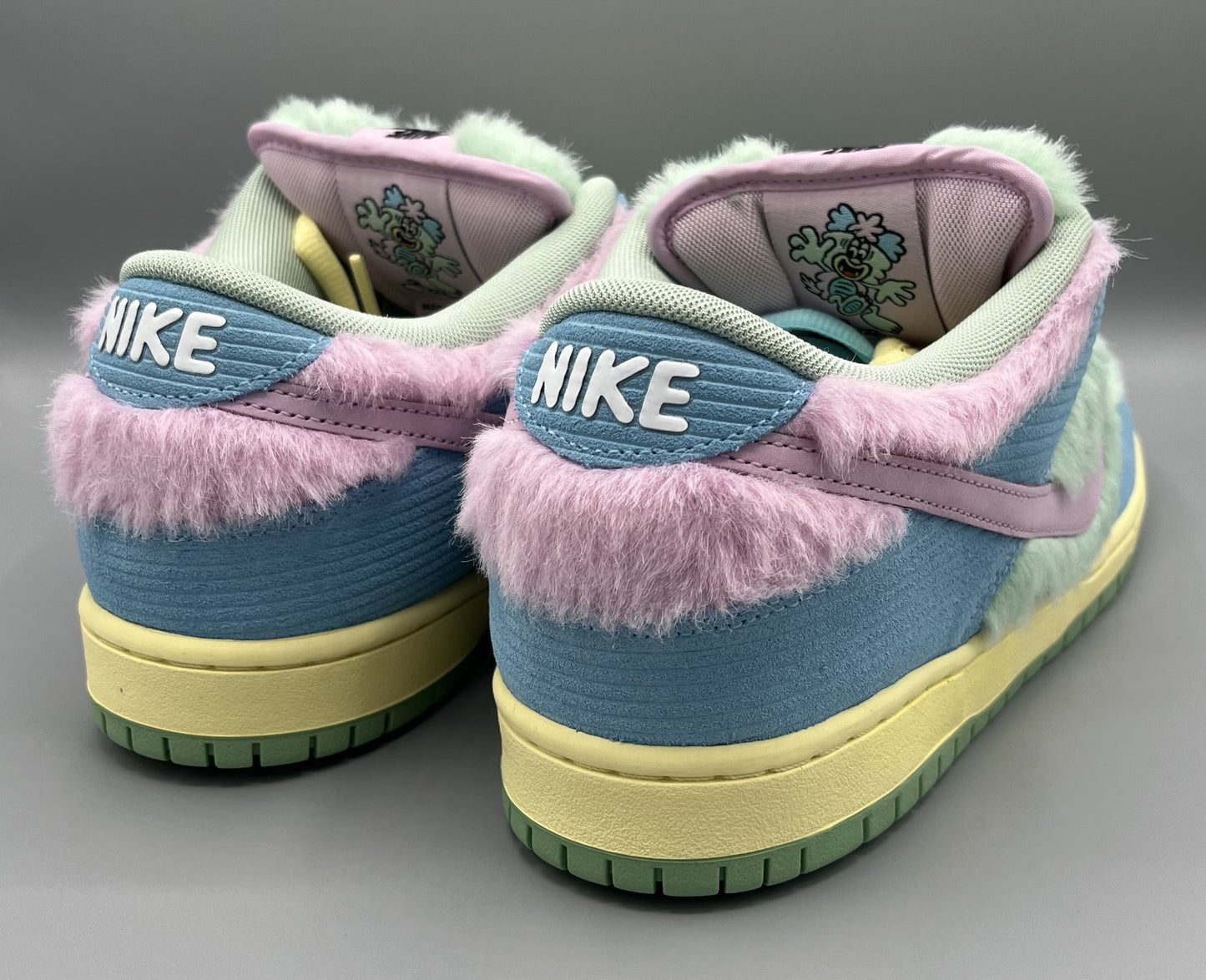 Le graphiste japonais Verdy renouvelle sa collaboration avec Nike SB pour une nouvelle version de la Dunk Low Visty. Ce design pastel et pelucheux présente une tige en fausse fourrure rose pâle et sauge, reflétant parfaitement le personnage de Visty. Les superpositions à rayures bleues évoquent son ventre, tandis que les touches de rose s'inspirent de sa coiffure. Des lacets et une semelle jaunes complètent l'ensemble, accompagnés d'un tag rose bonbon Verdy x Nike SB.